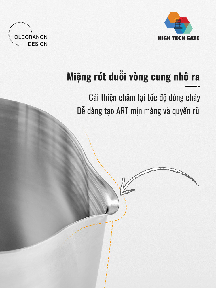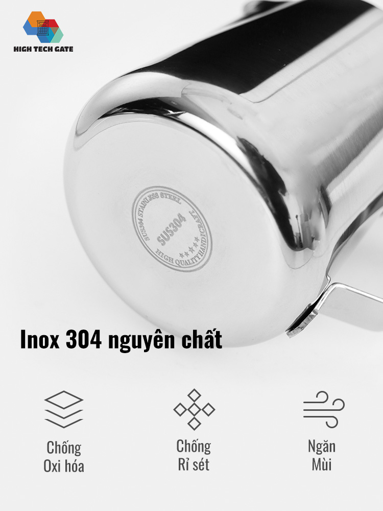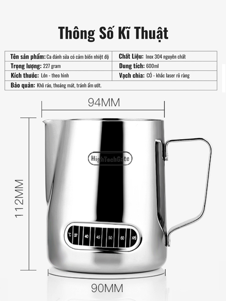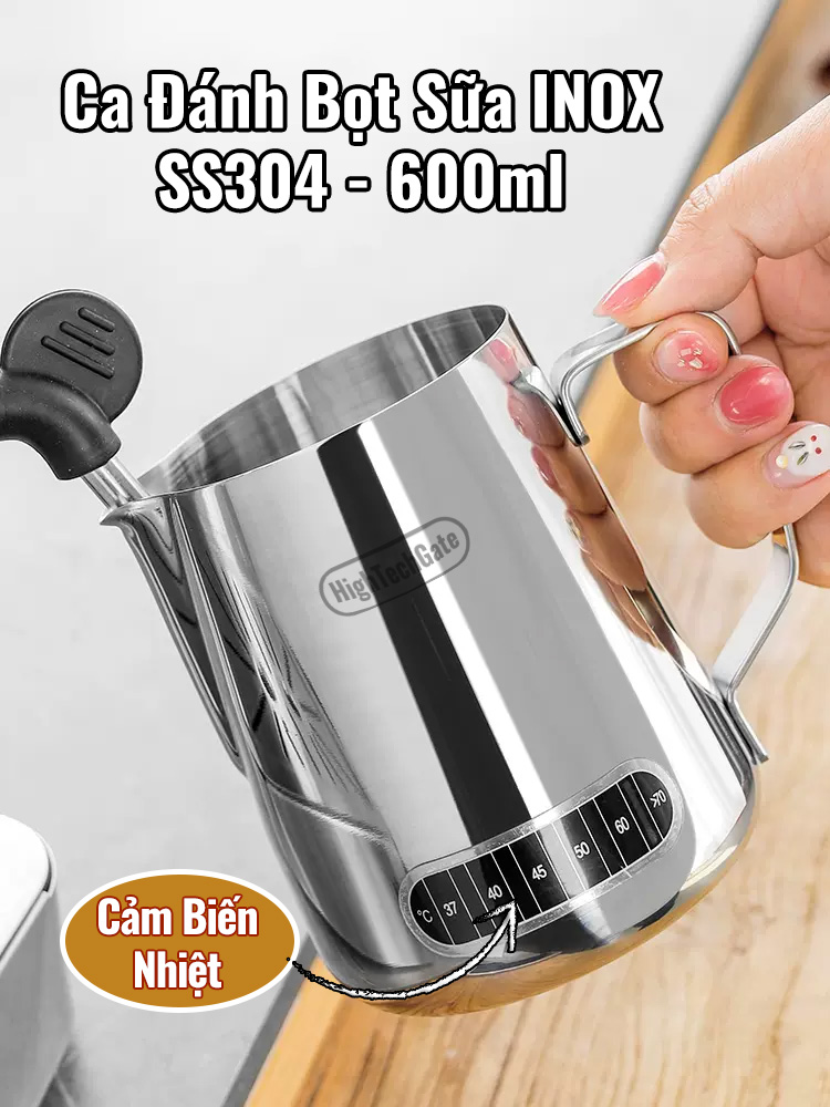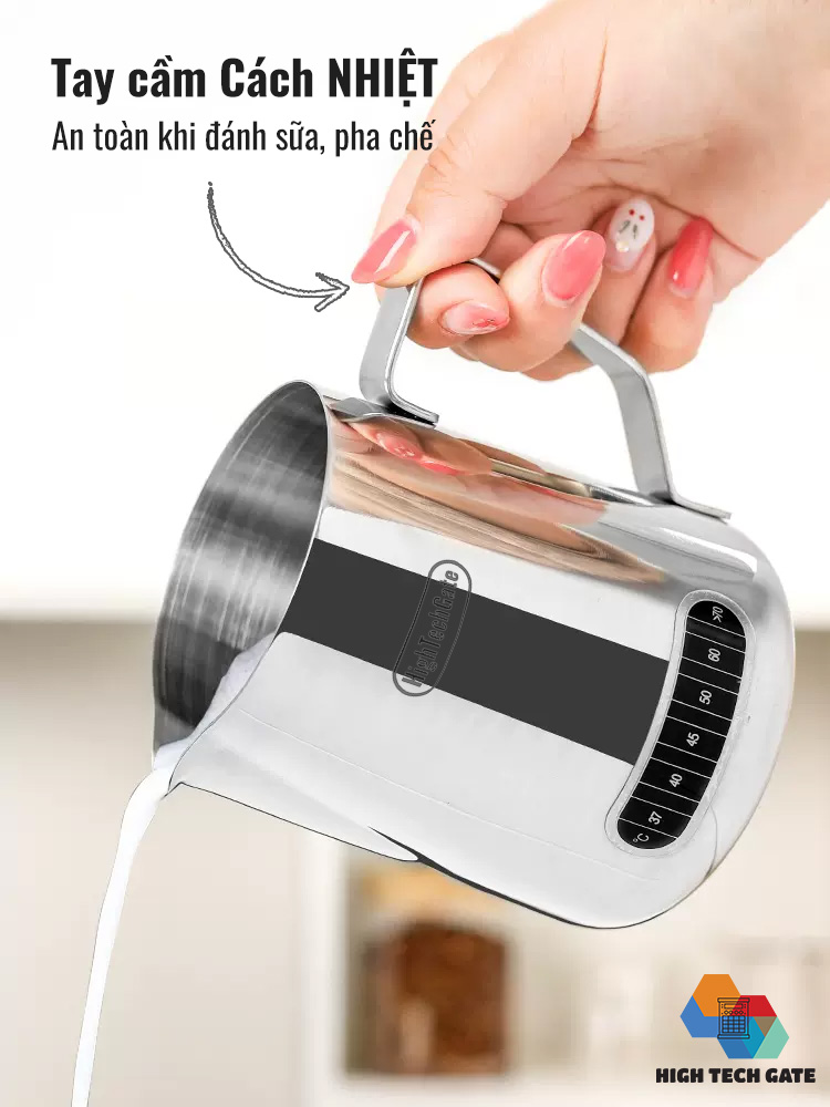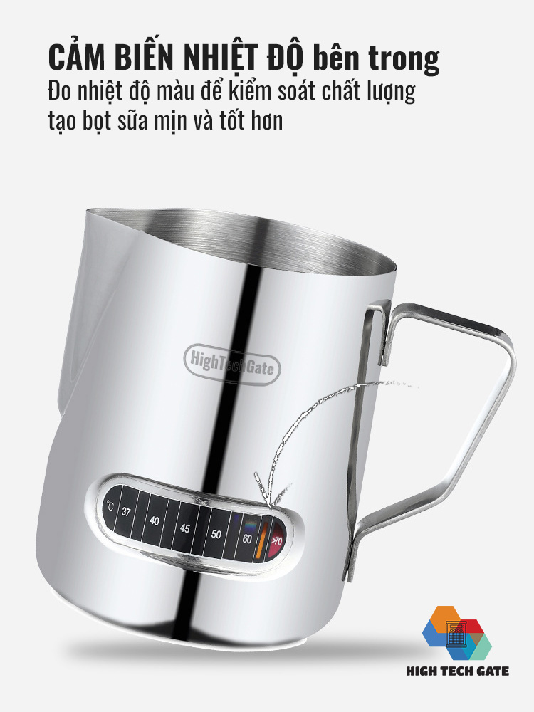 Ca đánh sữa inox HighTechGate 600ml MP60, tạo bọt sữa có cảm biến nhiệt độ an toàn cho người sử dụng
