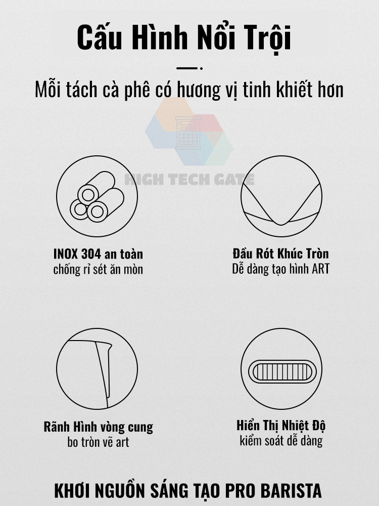 Ca đánh sữa inox HighTechGate 600ml MP60, tạo bọt sữa có cảm biến nhiệt độ thông minh