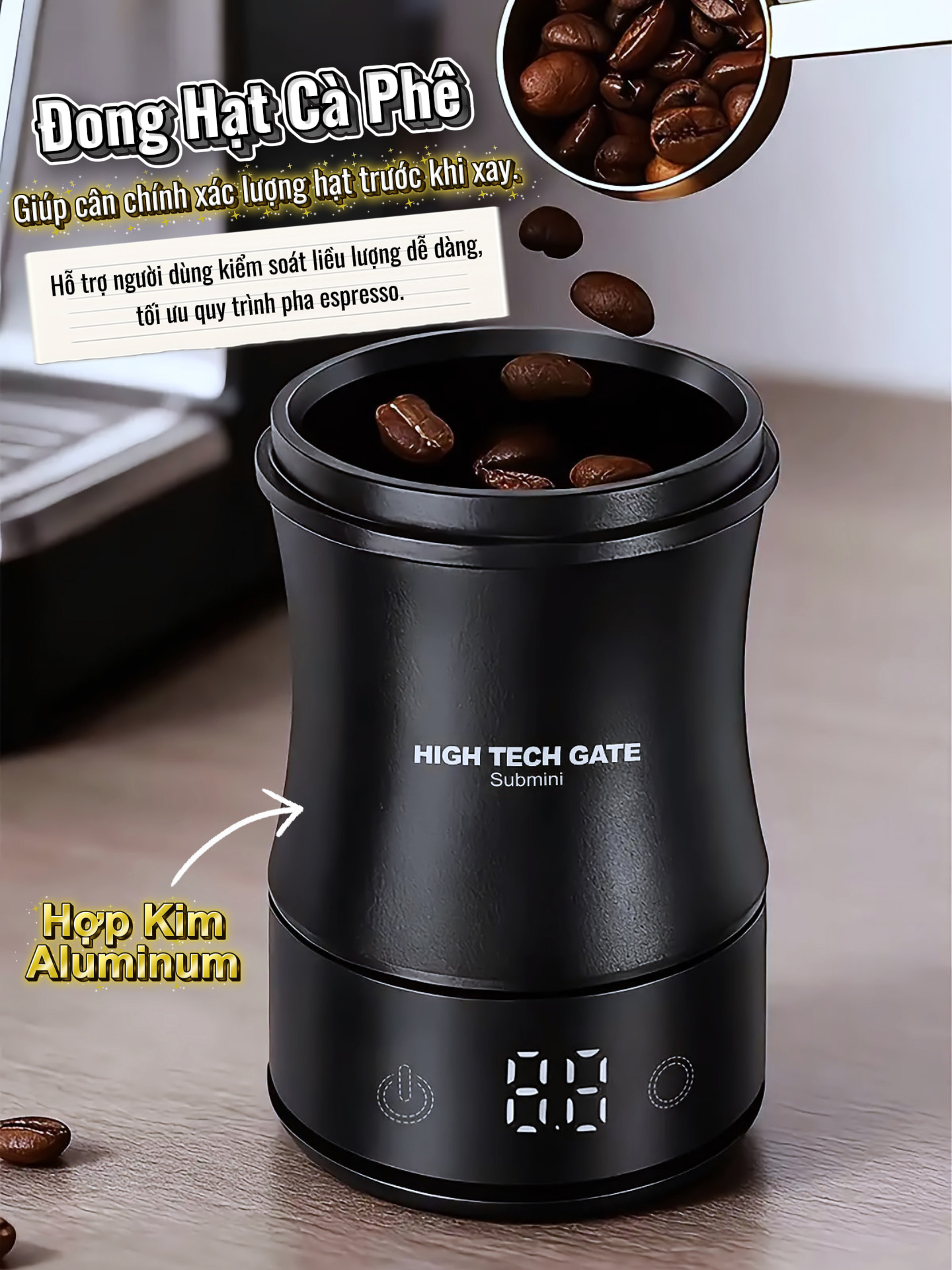 Cân đong bột cà phê Submini 58mm – Dosing Cup tích hợp cân điện tử là phụ kiện không thể thiếu cho người pha cà phê tại nhà và người chơi espresso muốn kiểm soát liều lượng chính xác trong từng bước pha.