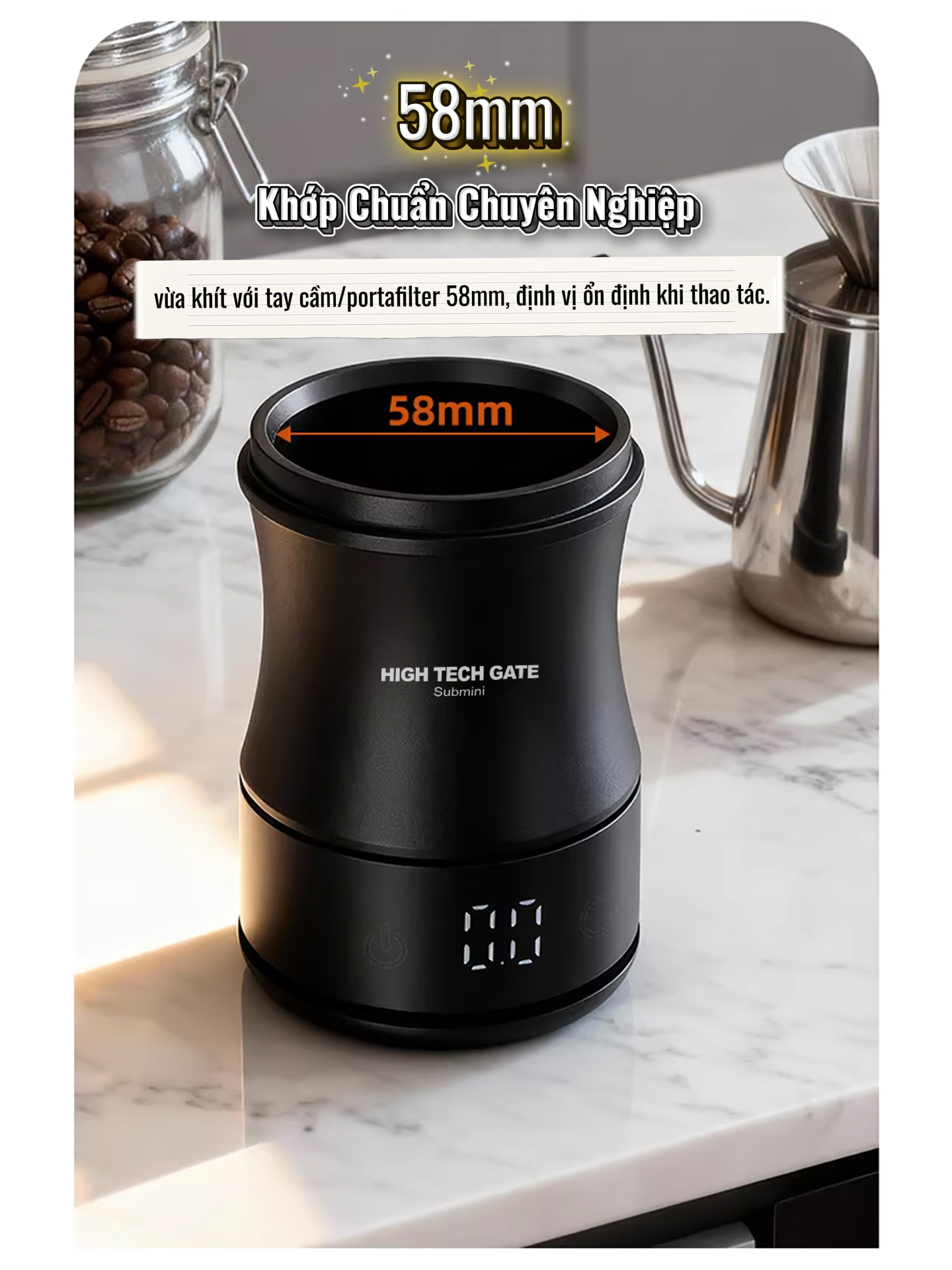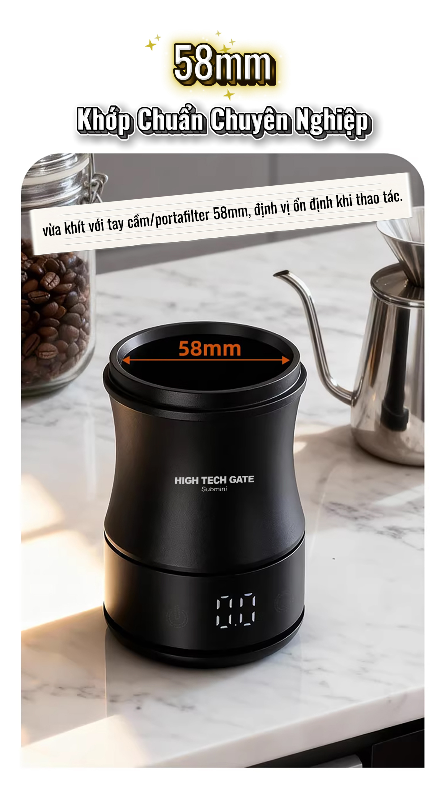 Sản phẩm cho phép đong bột cà phê sau khi xay, đồng thời đong hạt cà phê trước khi xay, giúp kiểm soát đúng lượng sử dụng, hạn chế lãng phí và đảm bảo hương vị ổn định cho mỗi ly cà phê. Thiết kế dạng dosing cup chuẩn 58mm, vừa khít với tay cầm/portafilter 58mm phổ biến, giúp đổ bột gọn gàng, hạn chế rơi vãi.