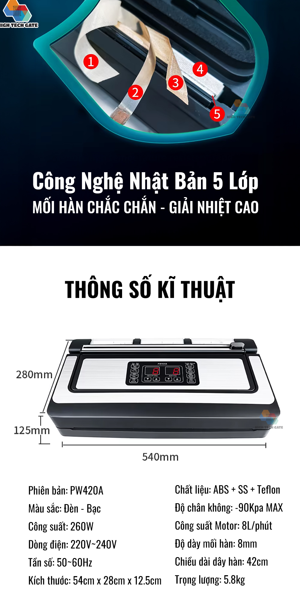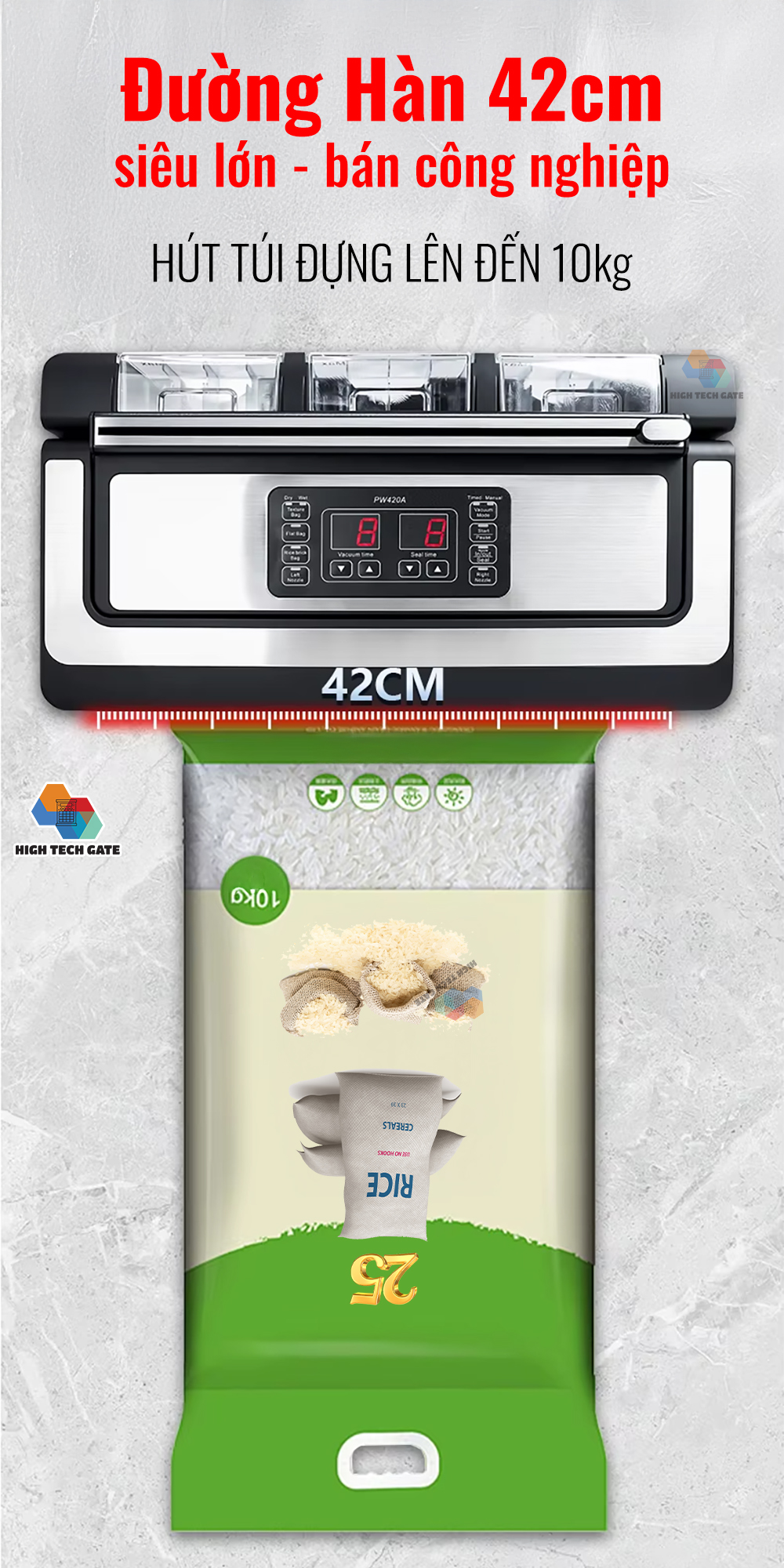 2.Chiều dài dây hàn bán công nghiệp, lên đến 42cm. Siêu lớn và dày dặn, chuẩn công nghệ NHẬT BẢN 5 lớp, từ đó có thể hút được các túi loại lớn, lên đến 10kg thực phẩm. Hút gà vịt, tôm hùm, cá kích cỡ lớn đều có thể đáp ứng với máy hút chân không HTG P420A