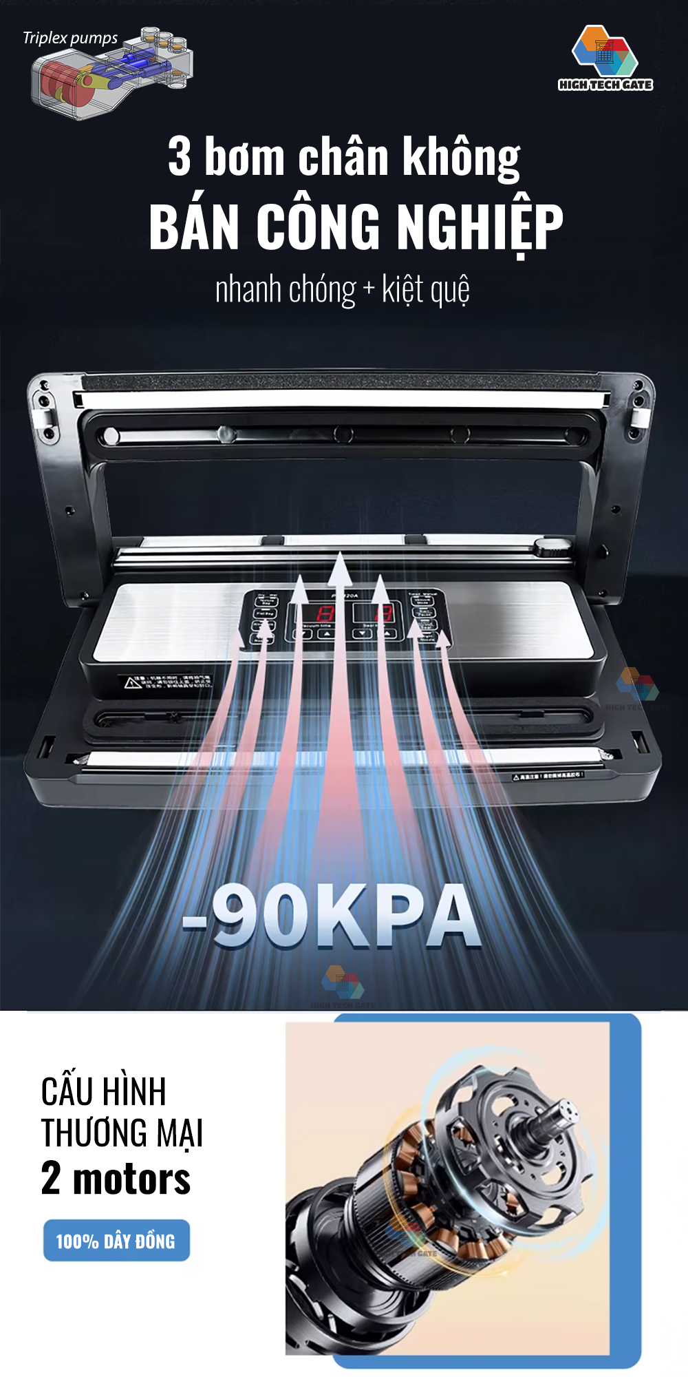 3.Với mục tiêu phân khúc khách hàng cho hộ kinh doanh thực phẩm, nhà hàng ,quán ăn...Phiên bản máy hút chân không HTG P420A được trang bị động cơ gấp 3 lần máy ép chân không thông thường, với tích hợp 3 bơm chân không bán công nghiệp. Từ đó cho khả năng hút cực kì mạnh mẽ và kiệt quệ.
