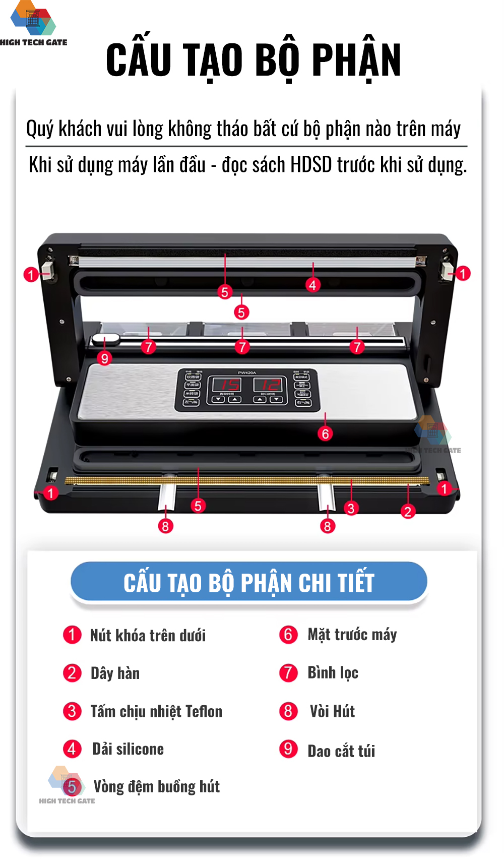 5. Thiết kế phím bấm cơ học, các chế độ được phân định rõ ràng cho từng loại túi hút, và hơn nữa là thiết lập cơ chế hút tùy chọn, dù là tự động theo timer hẹn giờ, hay bán tự động hút hàn tùy ý ở phiên bản máy hút chân không HTG P420A