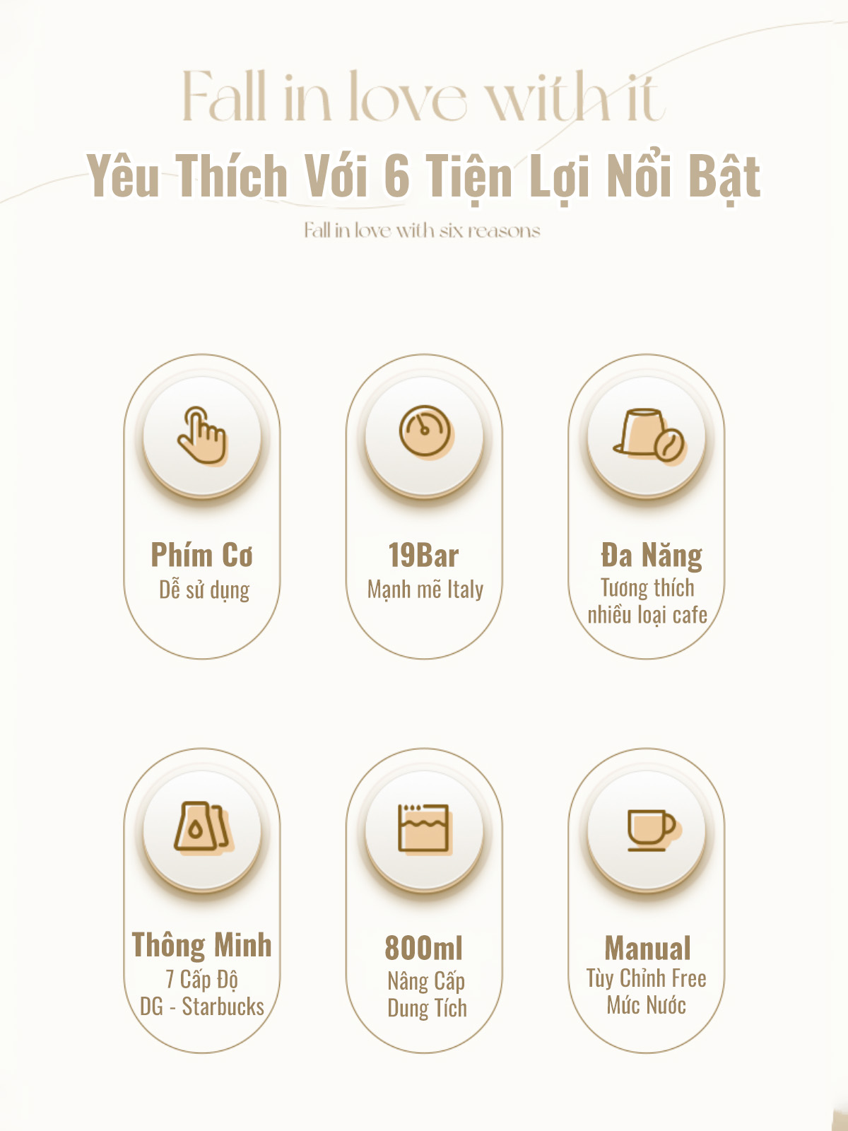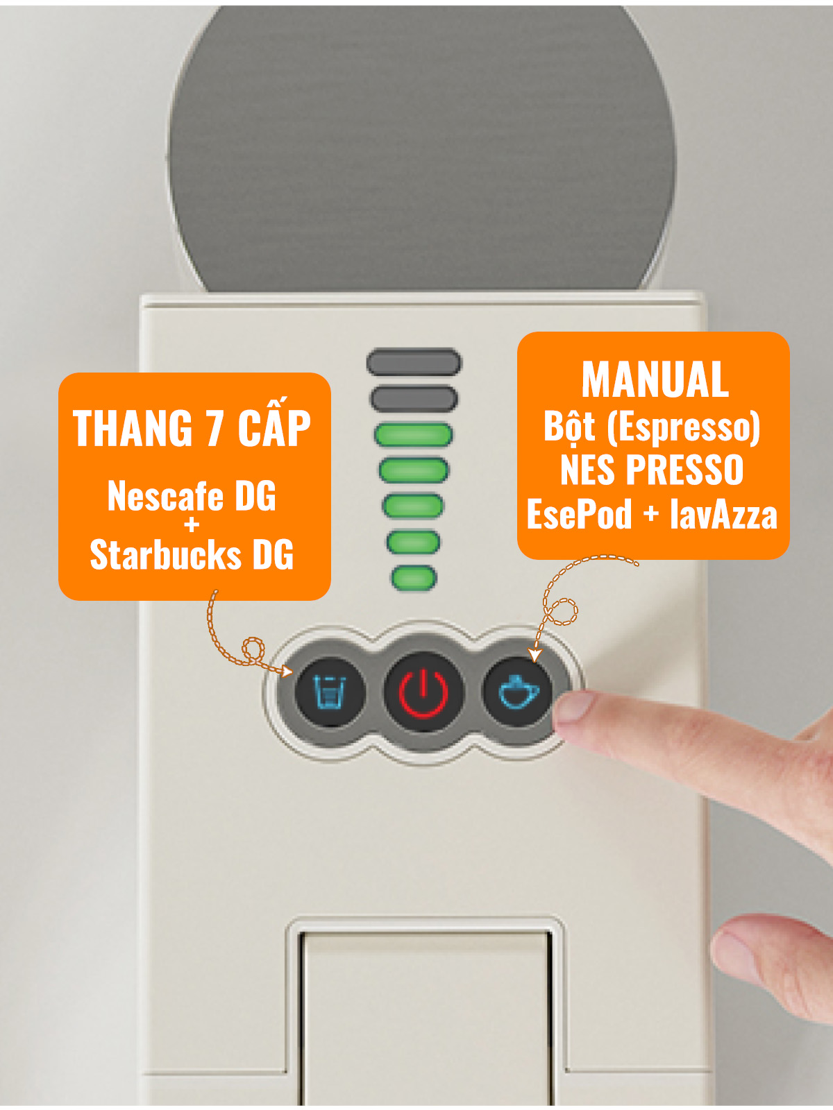 1 phiên bản nhỏ gọn, xinh xắn và có thể pha chế mọi loại cà phê giúp bạn thỏa thích chọn hương vị theo sở thích của mình, đặc biệt với lập trình thông minh 7 cấp độ thang nước. Trọn vẹn và tiện lợi trong thưởng thức cà phê cho gia đình và văn phòng.