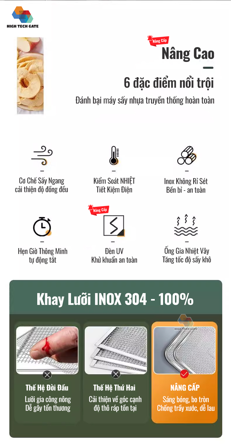 Trang bị 8 khay sấy bằng inox 304 chống dính an toàn, với thiết kế lỗ khay 3mm siêu nhỏ nâng cấp toàn diện hơn so với khay sấy đời cũ lỗ đến 8mm. Giúp khả năng sấy khô các loại hạt một cách dễ dàng hơn. Cùng với đó là hiệu quả thông khí đồng đều hơn.