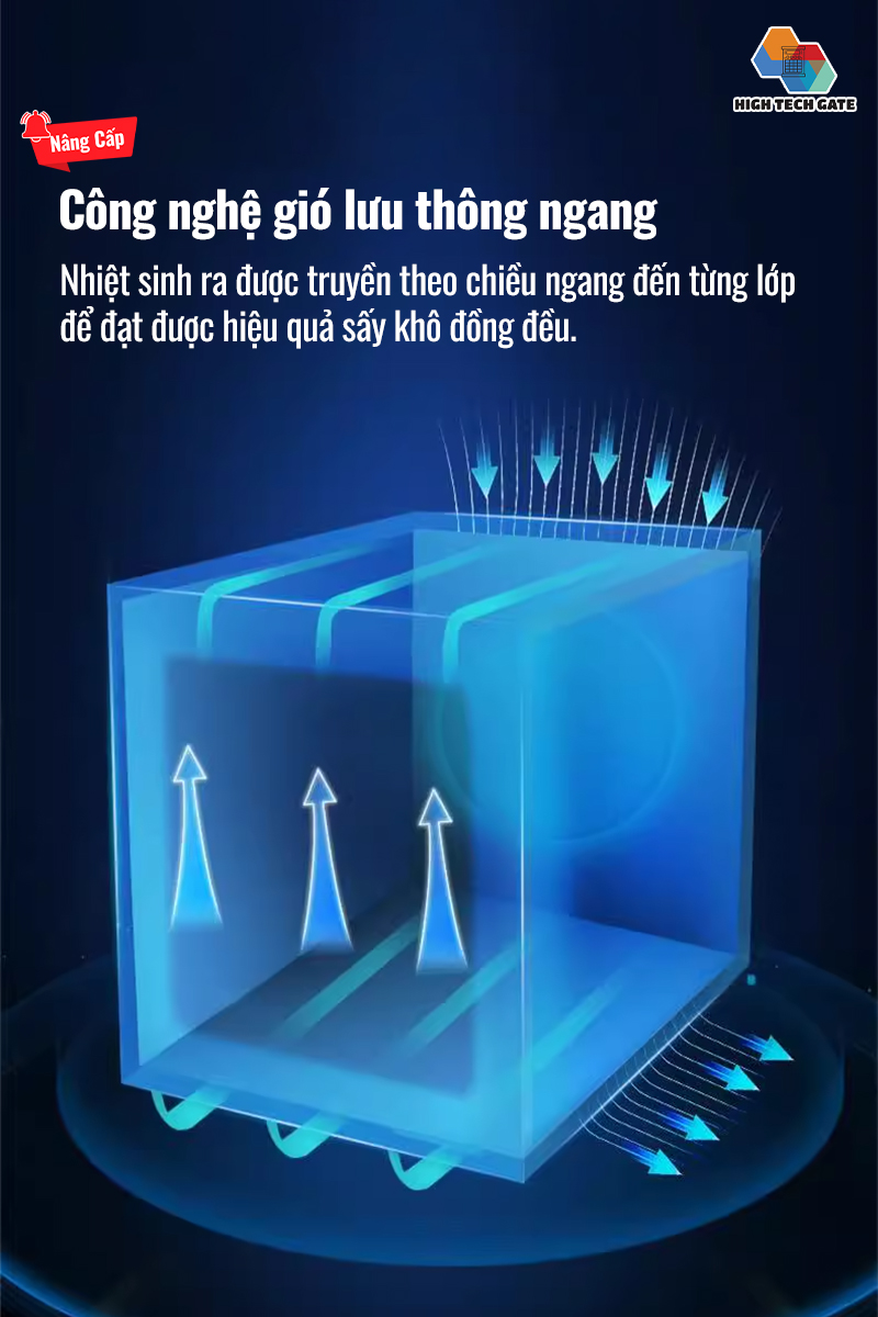 Hệ thống sấy khô cơ chế ngang cải tiến, luồng khí tiếp xúc trực tiếp với thực phẩm cả mặt trên và dưới, đảm bảo quá trình sấy được đồng bộ và thực phẩm được đồng đều hơn.