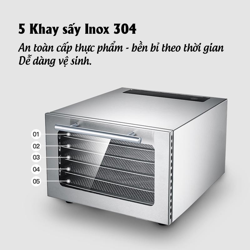 - Thiết kế 5 khay sấy Inox 304 an toàn cấp thực phẩm cao, lỗ sấy nâng cấp nhỏ hơn, chỉ với 3mm