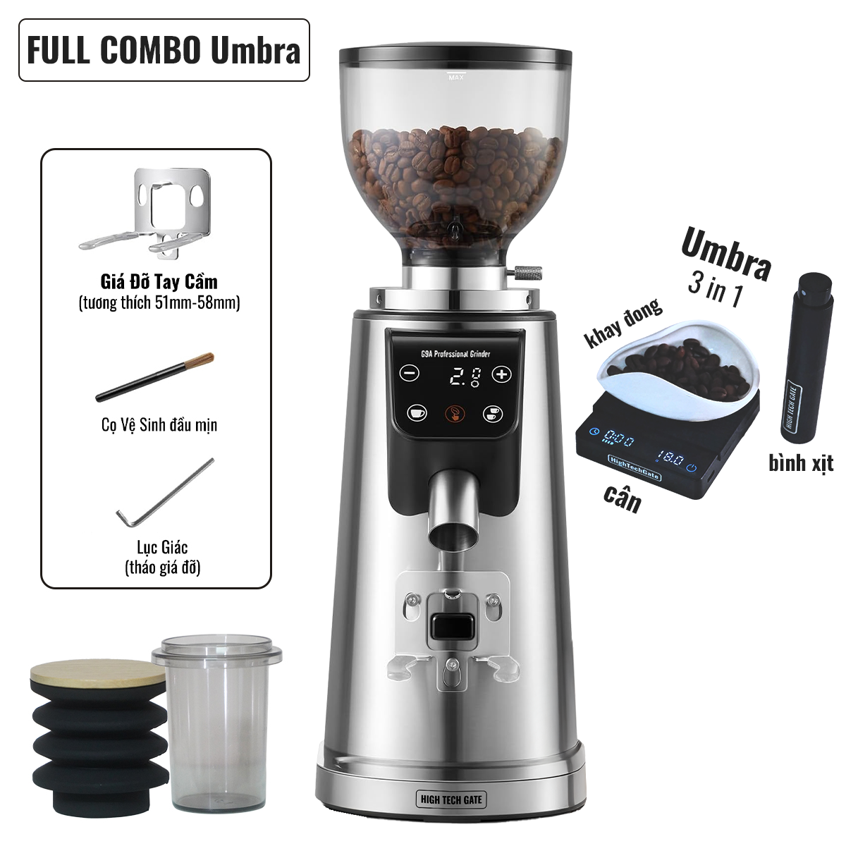 Ngoài ra, ở phiên bản G9A Full Single Dose, người dùng được trang bị thêm 1 cốc hứng bột cà phê 58mm và 1 nón thổi single dose bằng gỗ walnut cao cấp, giúp xay sạch hoàn toàn lượng cà phê còn sót, đảm bảo độ tươi mới và chính xác trong từng shot espresso.