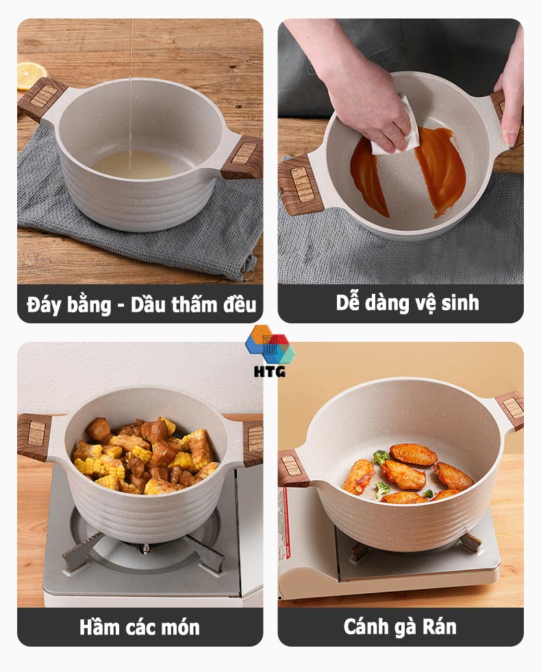 - Đáy bằng, giúp thấm đề dầu mỡ vào các món ăn khi rán, chiên, xào... cùng với đó là độ sâu lớn, giúp tạo thể tích cao, thuận tiện cho việc hầm nấu, ăn lẩu, nấu canh