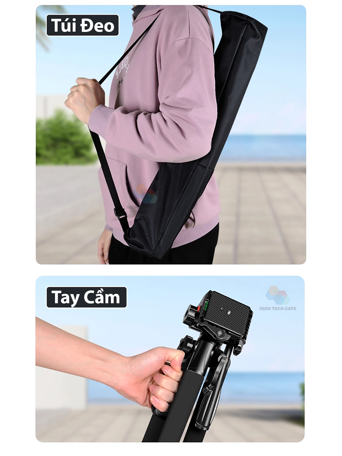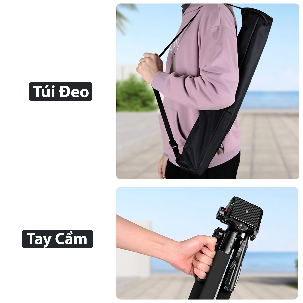 Đặc biệt, sản phẩm đi kèm túi đeo tiện lợi, giúp mang theo dễ dàng khi di chuyển, du lịch hoặc tác nghiệp ngoài trời – vừa bảo vệ tripod, vừa tăng tính chuyên nghiệp. Ngoài ra còn thiết kế tay cầm nhanh để người dùng tiện lợi hơn trong khâu di chuyển.