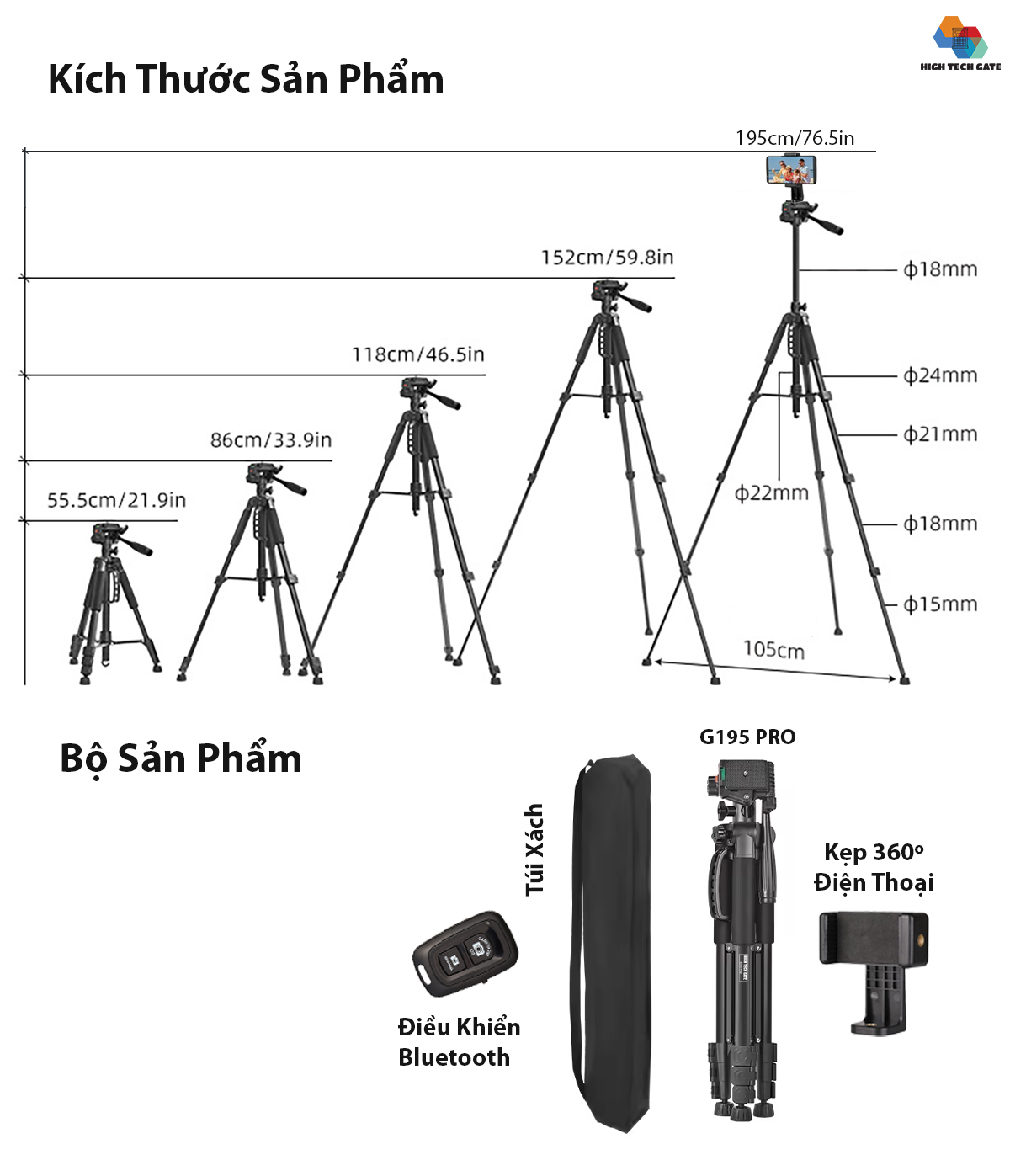 Tripod G195 PRO có 5 mức chiều cao: 55.5/86/118/152/195 cm, sải chân 105 cm cho khung hình ổn định. Đầu xoay 360°, gập 90° quay từ trên xuống; ống chân 24/21/18/15 mm + trục giữa Ø18 mm chắc chắn khi vươn cao. Bộ sản phẩm gồm Tripod, kẹp điện thoại 360°, điều khiển Bluetooth và túi đeo. Phù hợp livestream, quay review, vlog, chụp sản phẩm/food trong studio hoặc di chuyển ngoài trời.