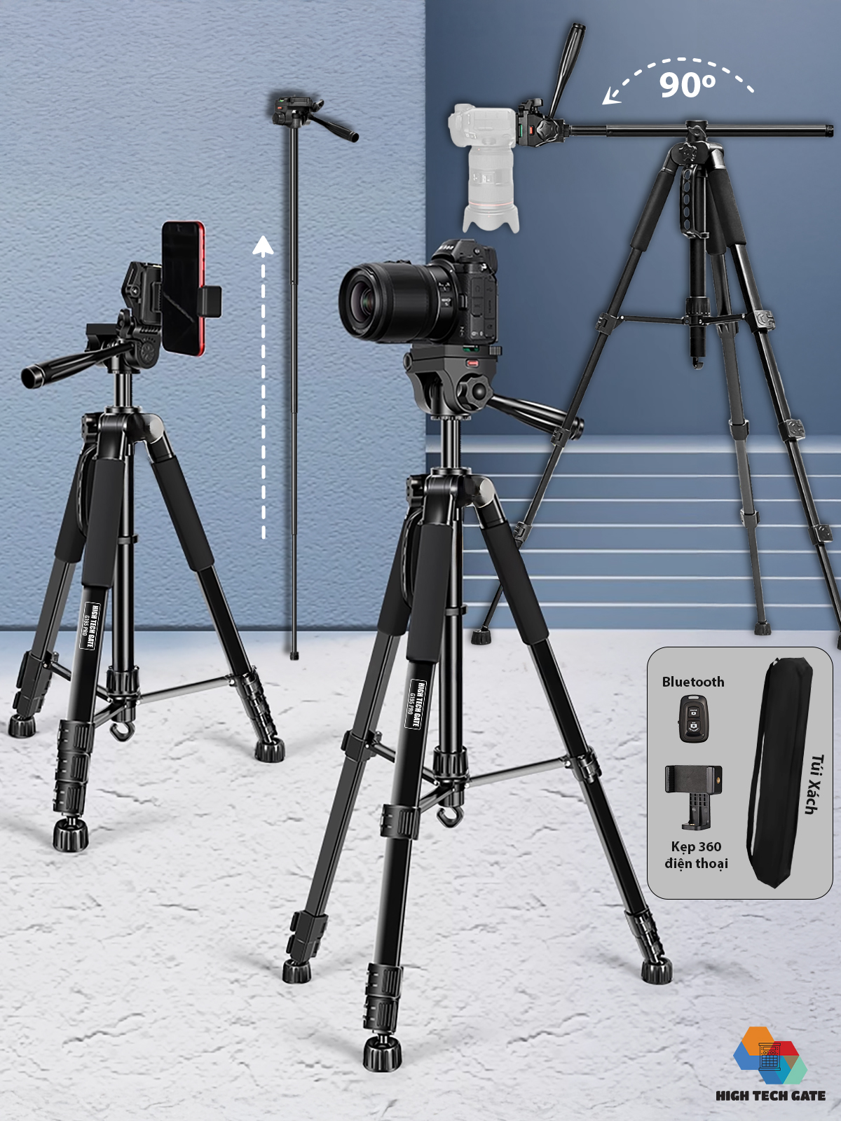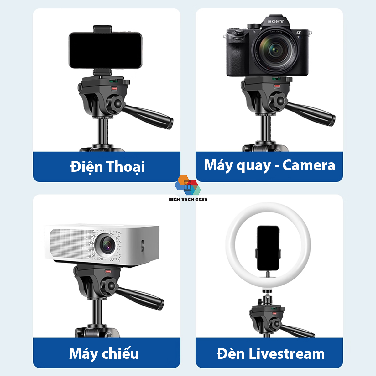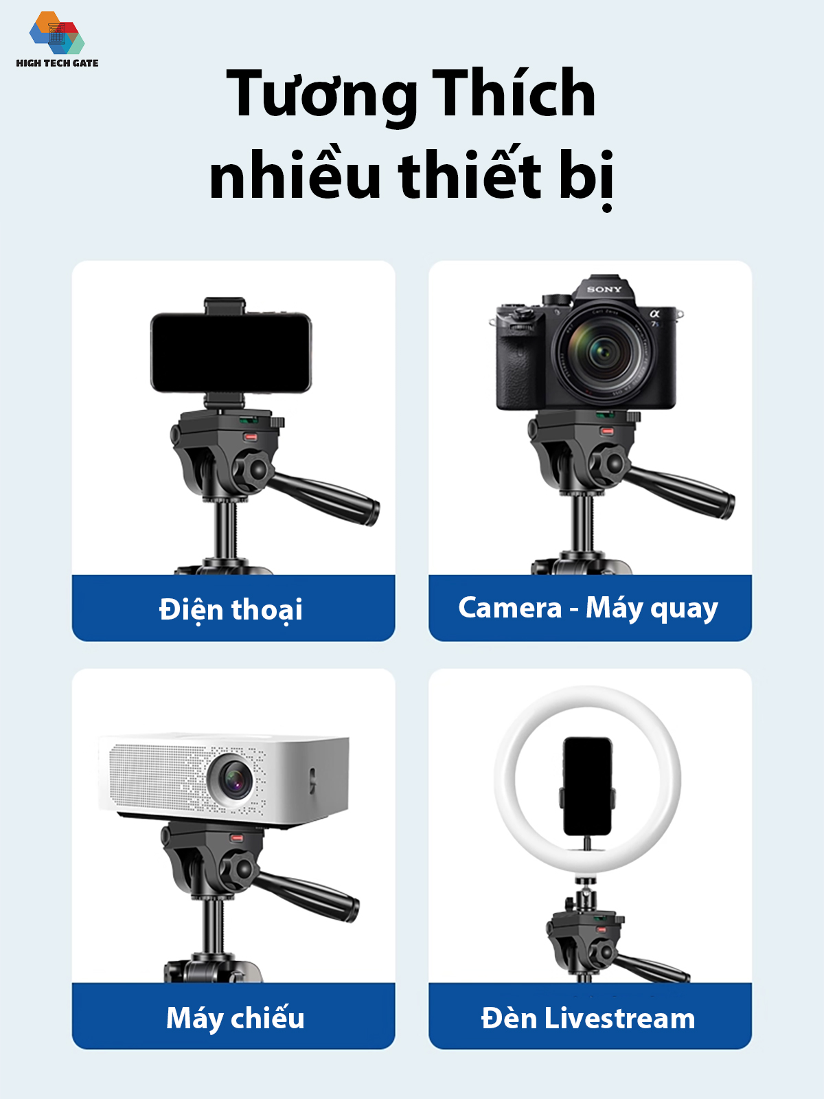 Tương thích rộng: điện thoại (kẹp 360°), máy ảnh/mirrorless (ngàm chuẩn 1/4″ nếu bạn đang dùng đầu tiêu chuẩn).