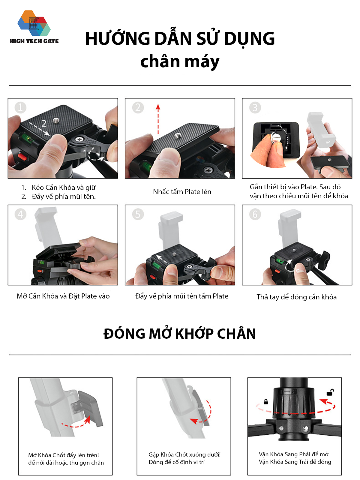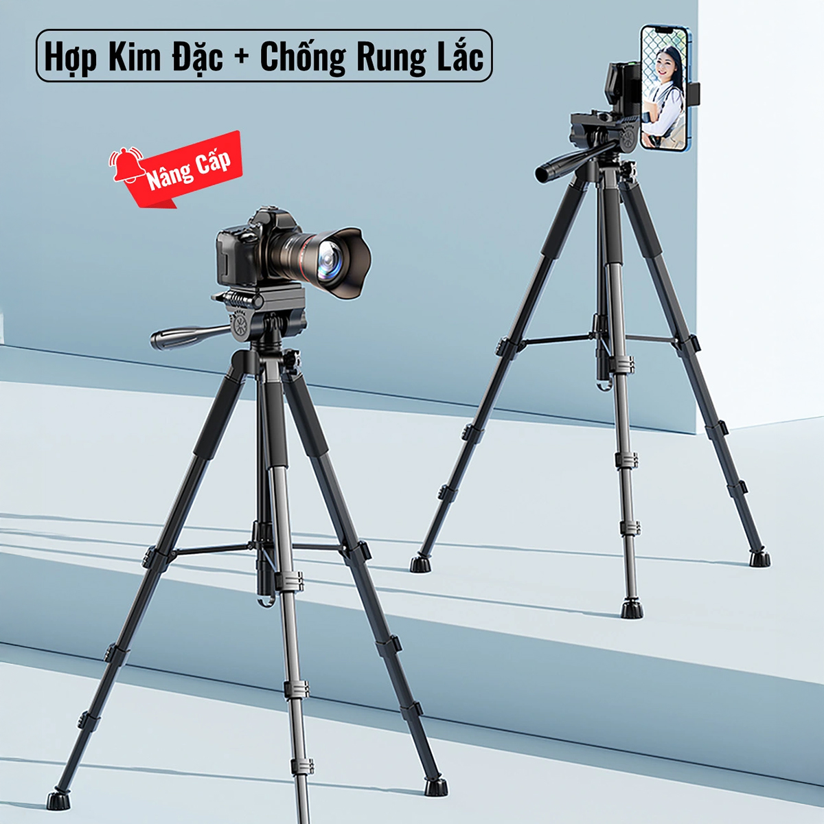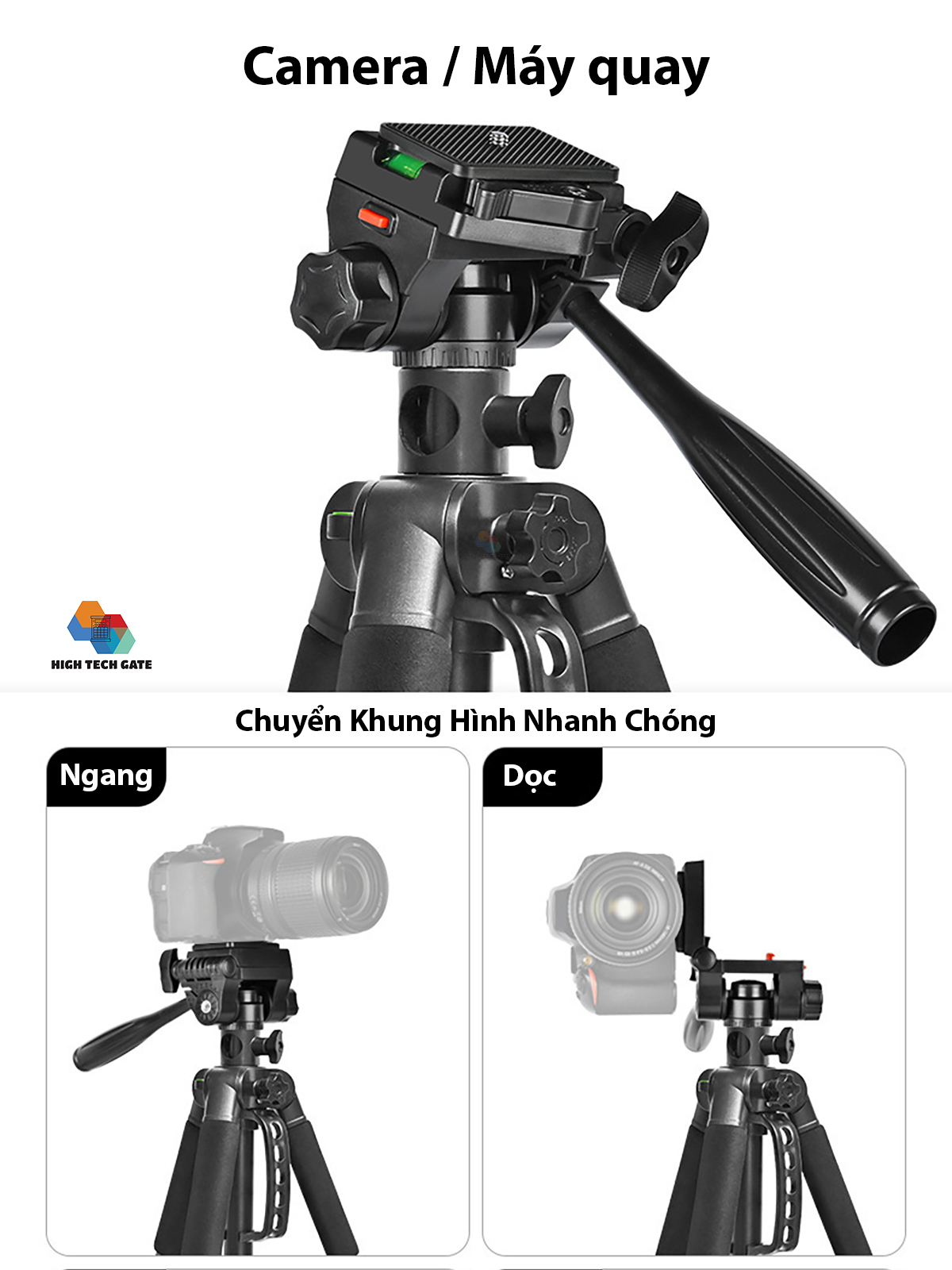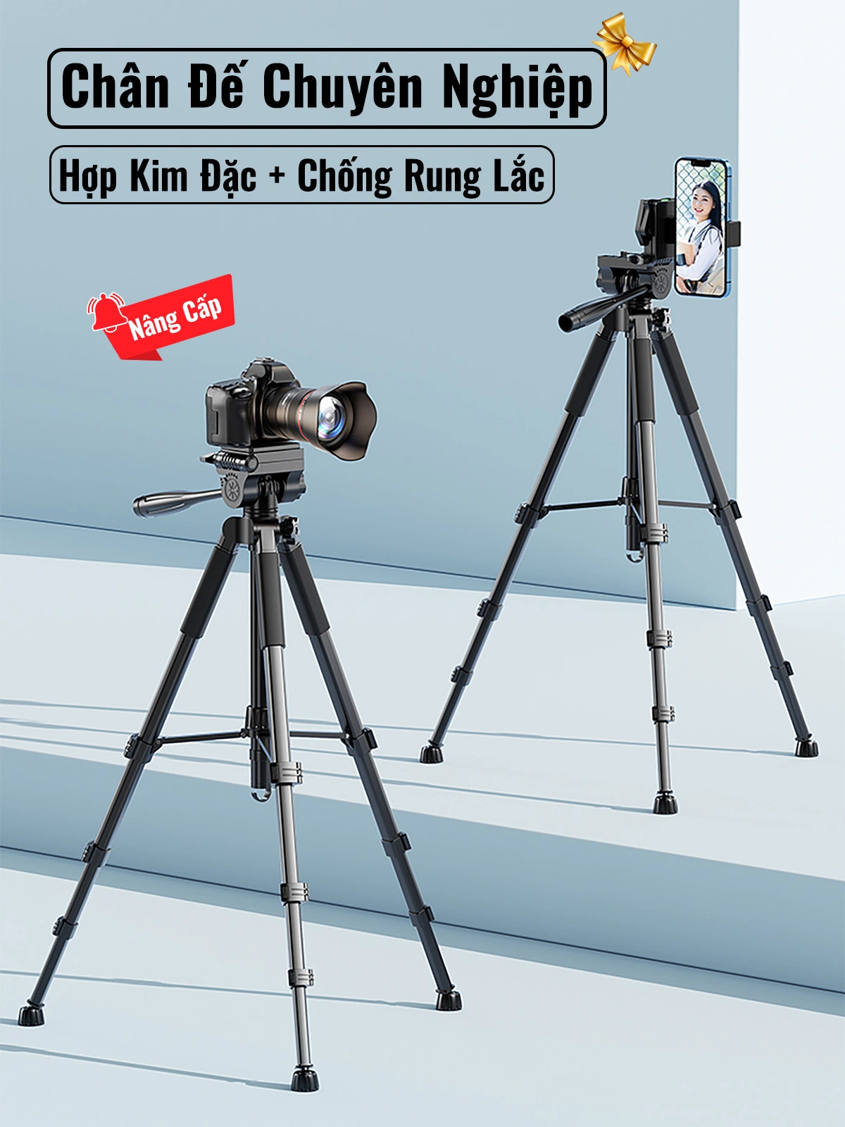 Tương thích rộng: điện thoại (kẹp 360°), máy ảnh/mirrorless (ngàm chuẩn 1/4″ nếu bạn đang dùng đầu tiêu chuẩn).